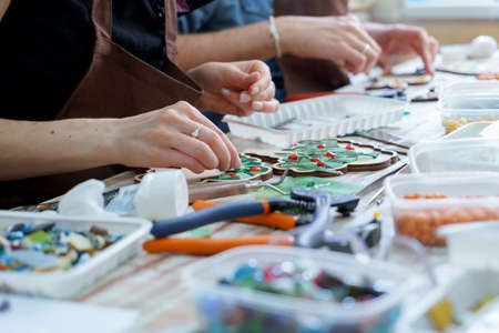 The artist maker mosaic in a wooden harvesting. Female hands closeup collect mosaic of colored stones. Human activity to workplace
