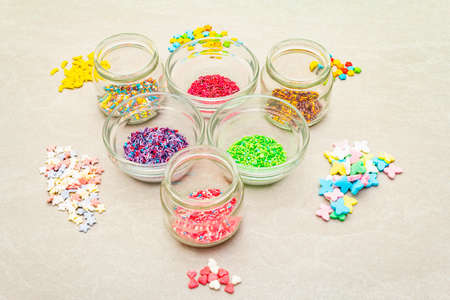 Assortment of various Easter decorative sugar sprinkles, Food background. In glass bowls on stone background