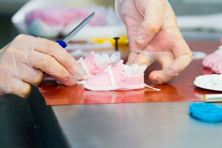 The chef prepares a decoration for the cake in the form of pink shoes