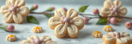 Decorative flower-shaped cookies arranged with small pastel blossoms on a marble surface during a spring celebration