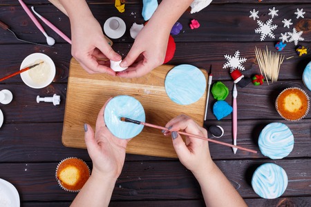Friends decorating cupcakes, view from above. Family culinary an