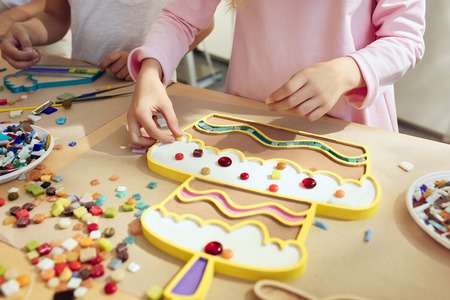 mosaic puzzle art for kids, childrens creative game. two sisters are playing mosaic