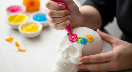 Hands of a girl decorating a skull with colorful flowers and candles
