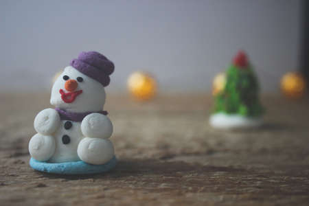 Christmas decor. A miniature figure of powdered sugar snowman with a purple hat stands on a wooden board.