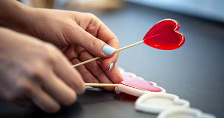 Close-up, the process of making heart-shaped lollipops.
