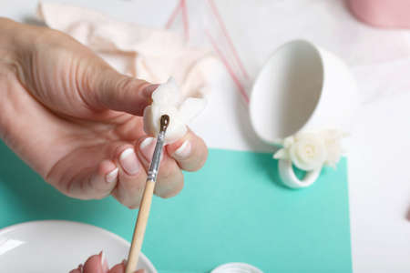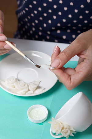 Roses with petals made of white polymer clay. A woman sticks them on a saucer. Crafts from polymer clay.
