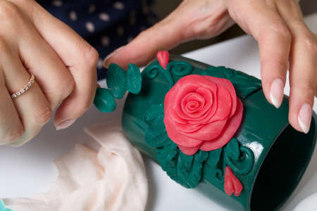 Woman glues polymer clay roses to a mug. Polymer clay of different colors. Crafts from polymer clay.