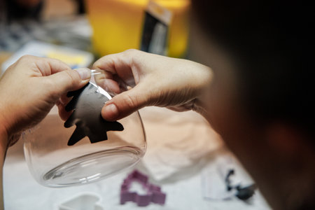 A person focuses on adhering a black tree shape to a glass jar at a Cristmas Craft workshop. The table is cluttered with various crafting materials surrounded by evening light.