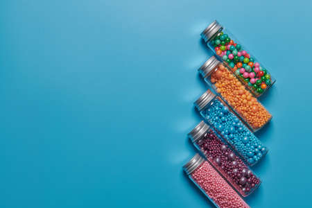 colored candies in jars on a blue background