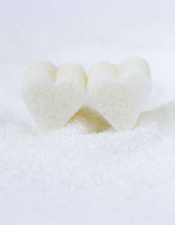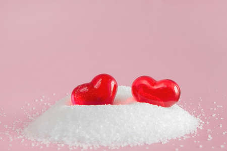 Two heart-shaped sugar candies sit together on a dark background, surrounded by sparkling sugar crystals. Perfect for themes of love and celebration.