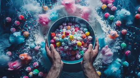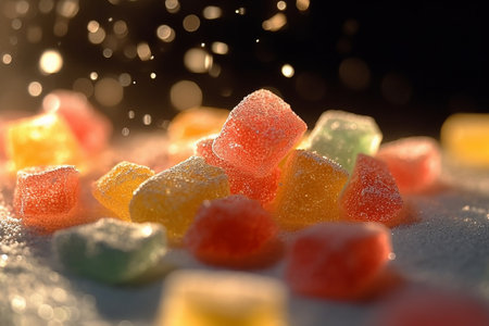 Bright and colorful gummy candies coated with sparkling sugar sit dramatically against a dark background, evoking feelings of joy and indulgence perfect for any celebration.