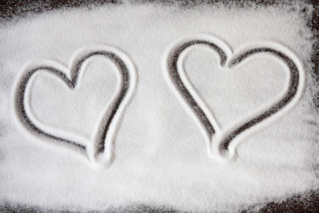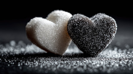 This close-up image showcases two heart shapes made of sugar, one black and one white, resting on a dark background. The sparkling texture adds a romantic and sweet touch, perfect for illustrating love and affection in creative works.
