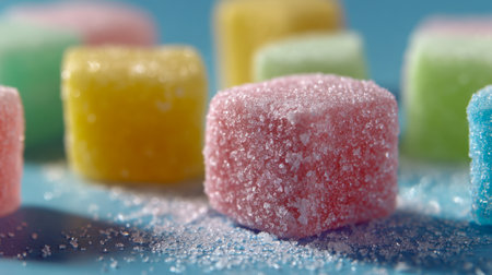 An arrangement of pastel-hued gummy candies sprinkled with shimmering sugar crystals, set against a gentle blue background that enhances their vivid, textured appeal.