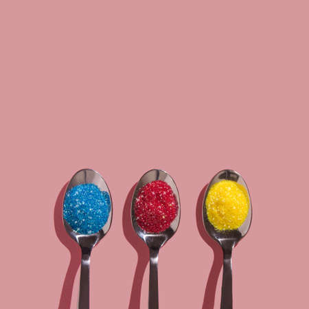 Three silver spoons arranged in line filled with colorful, shiny glitter piles – blue, red and yellow spangles on a pastel pink background. Creative minimal christmas flat lay concept. New Year idea