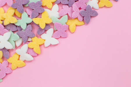 Colorful butterflies, a popular sugar confectionery topping, lie on a pink background diagonally in the left corner.