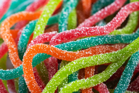 Multicolored jelly candies in the shape of the spaghetti sprinkled with sugar. Close up.