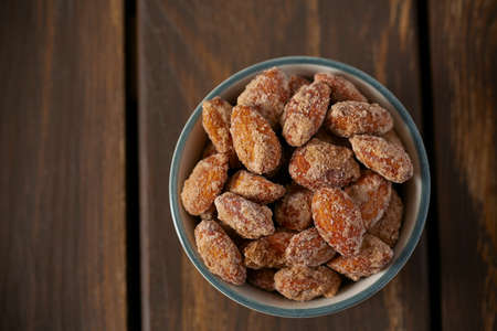 Candied or sugared almonds with honey and cinnamon in bowl on gray with Christmas decoration background. Traditional Christmas sweets for holidays. Top view, copy space