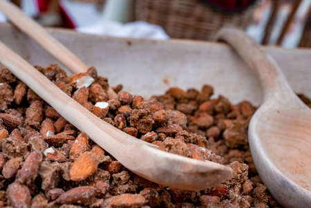 Close-up of roasted salted almonds scoop for sale at market in historic town