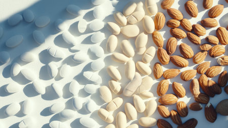 A visually striking arrangement showcasing a blend of white candies and brown almonds. Captured in natural light, this image emphasizes textures and creates captivating contrasts.