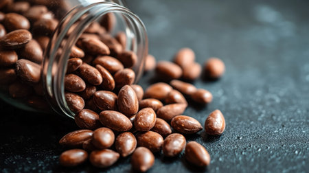 A captivating image of chocolate-coated almonds spilling from a glass jar, showcasing a delightful treat on a dark background, perfect for snack lovers.