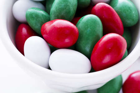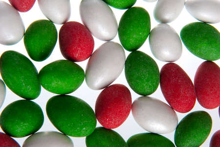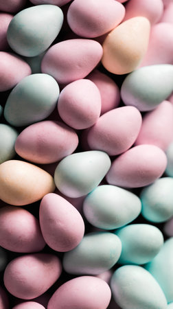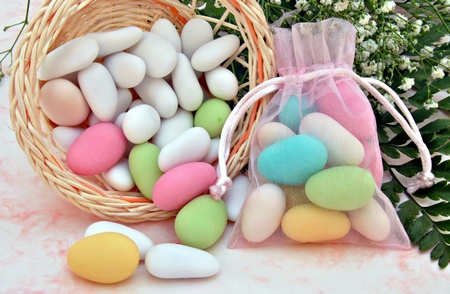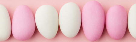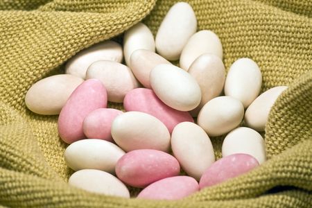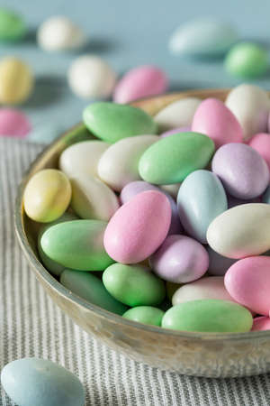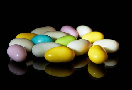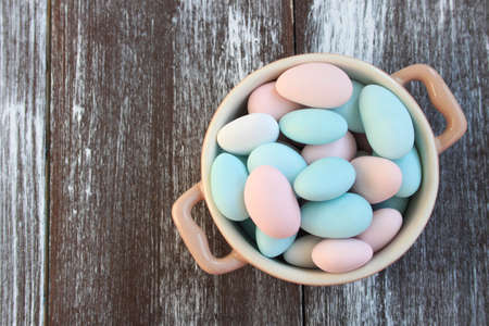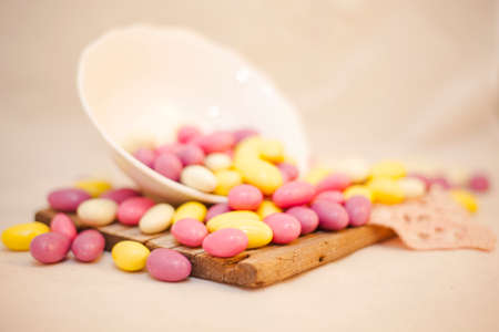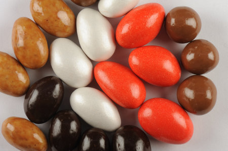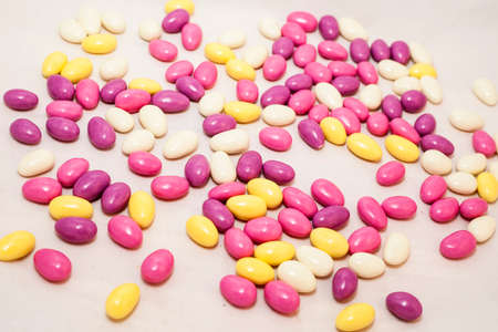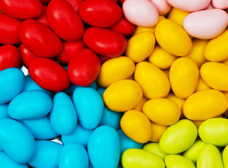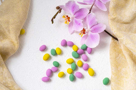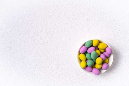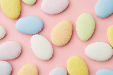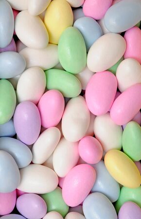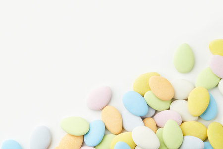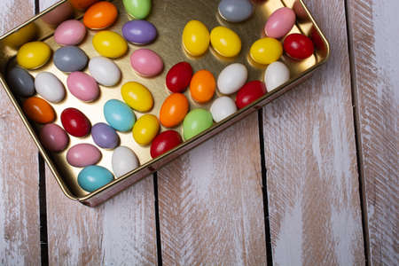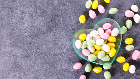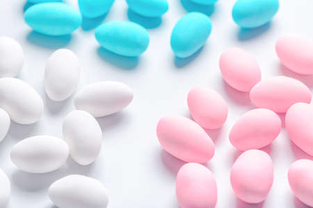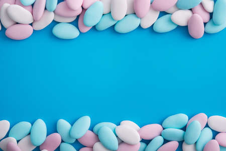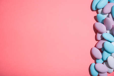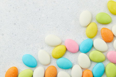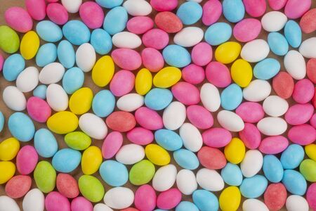 Top view of flat layed almond candies for special events. Colorful sweet confections for textured background and copy space