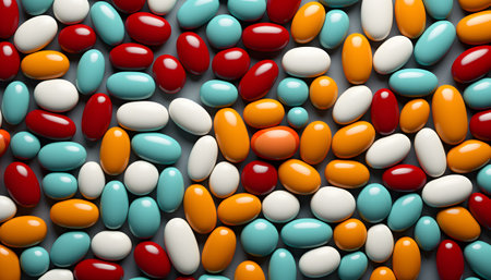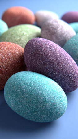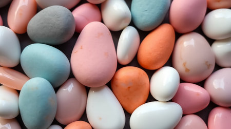 Coated stones in various pastel colors are scattered across a flat surface, creating an attractive arrangement. The smooth textures and soft hues invite a sense of calm and beauty.