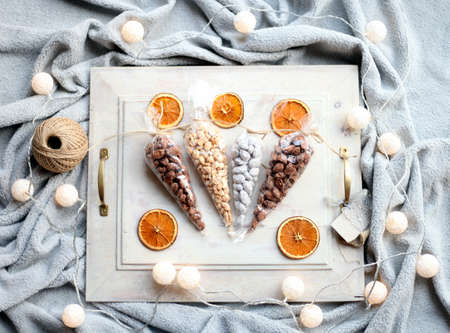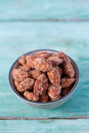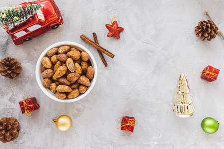 Candied or sugared almonds with honey and cinnamon in bowl on gray with Christmas decoration background. Traditional Christmas sweets for holidays. Top view, copy space