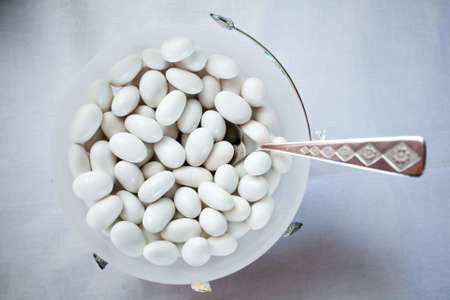 View from above of gold and silver glazed luxury almond candy treats in a white porcelain for special events. Sweet confections on brown background and copy space