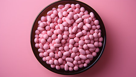 A light blue bowl filled with glossy pink candy eggs sits against a soft pastel pink background, creating a cheerful and vibrant display perfect for celebrations.