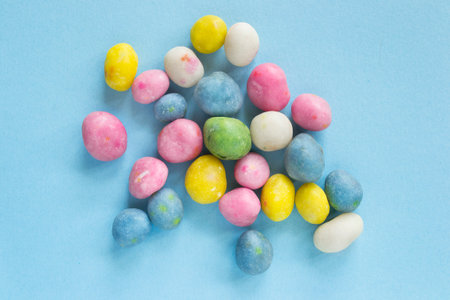 Overhead view of scattered multi colored candies by copy space over blue background. unaltered, sweet food and unhealthy eating concept.