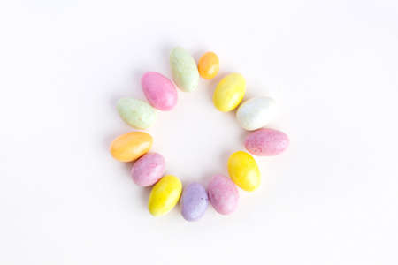 Assorted colorful chocolote eggs. Top view. jelly sweets