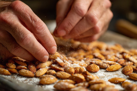 Hands carefully arrange roasted almonds on a tray, adding a light sprinkle of sugar. The warm afternoon light fills the cozy kitchen, highlighting the crunchy snacks.