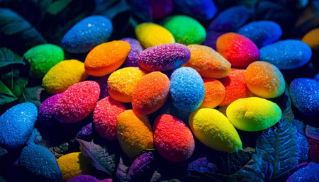 Bright firefly confetti in various colors rests on lush green leaves, creating a joyful ambiance