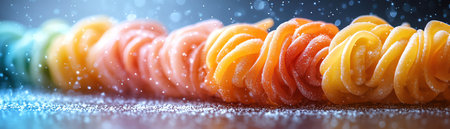 Colorful spiral pasta macro closeup with dreamy bokeh bright hues soft light food styling fantasy aesthetic