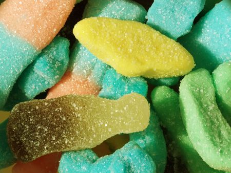Colorful gummy candies in a store display, showcasing a variety of shapes and flavors in bright, enticing colors.