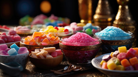 Bright and colorful gummy candies coated with sparkling sugar sit dramatically against a dark background, evoking feelings of joy and indulgence perfect for any celebration.