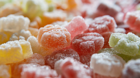 A tempting close-up of colorful sugared jelly candies, with a focus on their sparkling sugar coating and varied fruity colors.