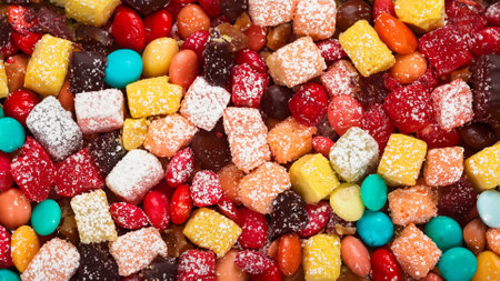 Colorful marmalade and sugar background closeup. Sweet dessert