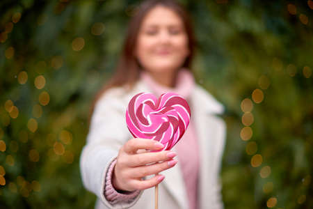 heart-shaped caramel candy in girl hand. Blurred lovely woman extending red heart-shape lolly-pop on stick to camera