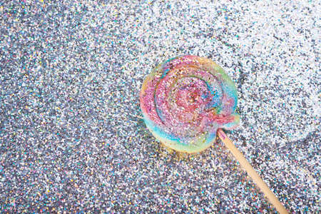 Close-up of rainbow swirled lollipop on glitter background, candy concept
