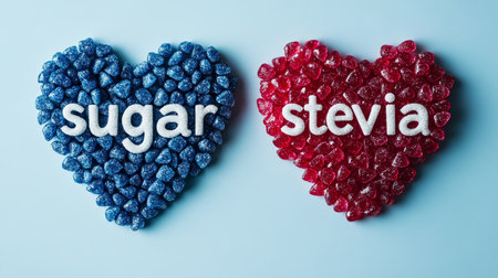 Sugar Vs. Stevia Two Sweet Hearts Concept, Valentine s Day Health. Red And Blue Candies