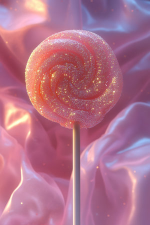 A delightful pink lollipop with a swirling design stands prominently on a white stick. The candy sparkles brightly against a backdrop of smooth, pastel-colored fabric that creates a whimsical, lighthearted mood ideal for celebrations or desserts.