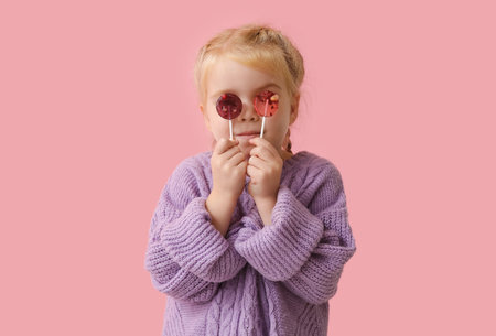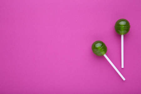 Overhead view of lollipops arranged side by side with copy space against pink background. unaltered, unhealthy eating and sweet food concept.
