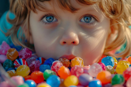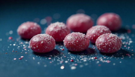 Macro shot of colorful hard candies with sparkling sugar crystals, captured in a bright and cheerful setting. Perfect for sweet and festive themes.