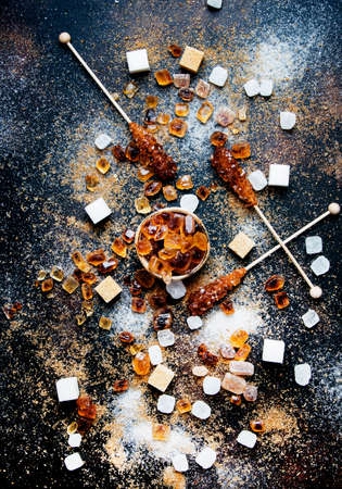 Sweet food background, assorted white and brown sugar on a dark background, top view