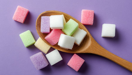 Collection of colorful sugar cubes arranged in a wooden spoon, scattered on a purple surface. The cubes are various shades of pastel colors.