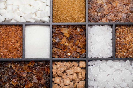 Various kinds of sugar in a wooden box. White refined, brown cane sugar collection