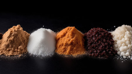 A captivating still life of various sugars elegantly arranged on a dark wooden table, with crystals glistening under soft lighting