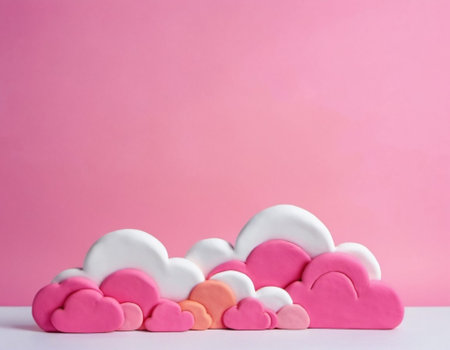 Cluster of pink clouds arranged in circular formation against solid pink background. Clouds appear of soft, fluffy material plasticine. Whimsical and dreamy atmosphere. AI generated. Copy space.