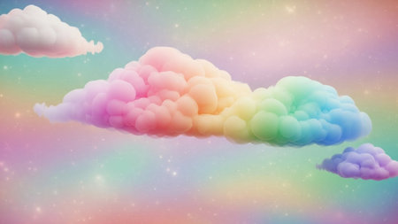 Soft, fluffy clouds are painted in vibrant rainbow hues against a dreamy, pastel-colored sky with subtle sparkles.